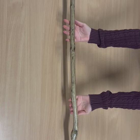 This hazel walking stick features a very unusual and eye-catching finish, with speckled wood grain and a gentle twist near the top of the shaft. The top showcases the natural cut of the wood, adding an organic charm to its design. Finished in a rich oil varnish, the stick is smooth to the touch yet keeps its rustic character. Ideal as a walking aid or hiking accessory, it's lightweight yet sturdy. The exact stick shown in the photo is the one you will receive. If you'd like it shortened, just let us know how much to trim in the order notes at checkout and we’ll customise it for you.