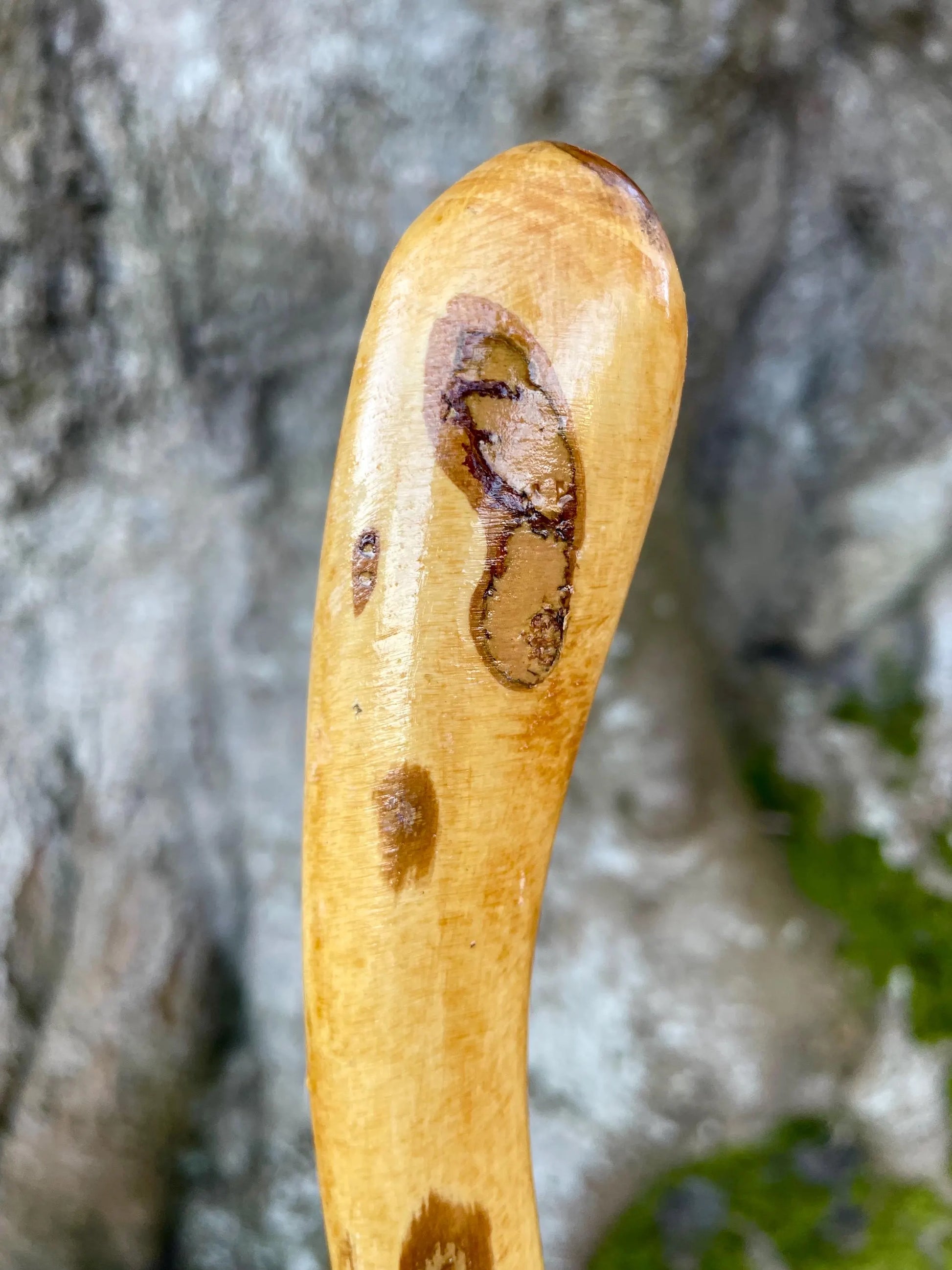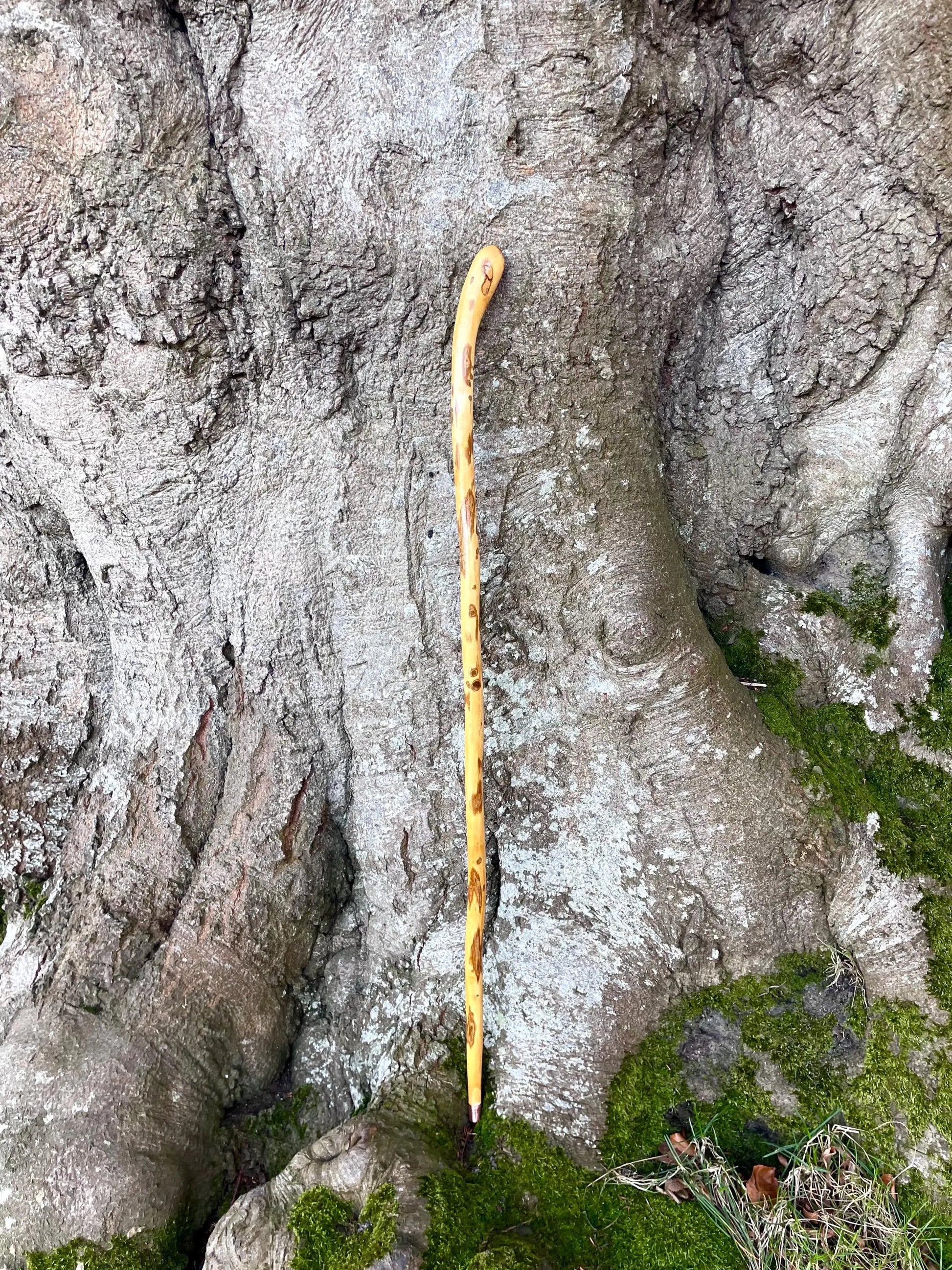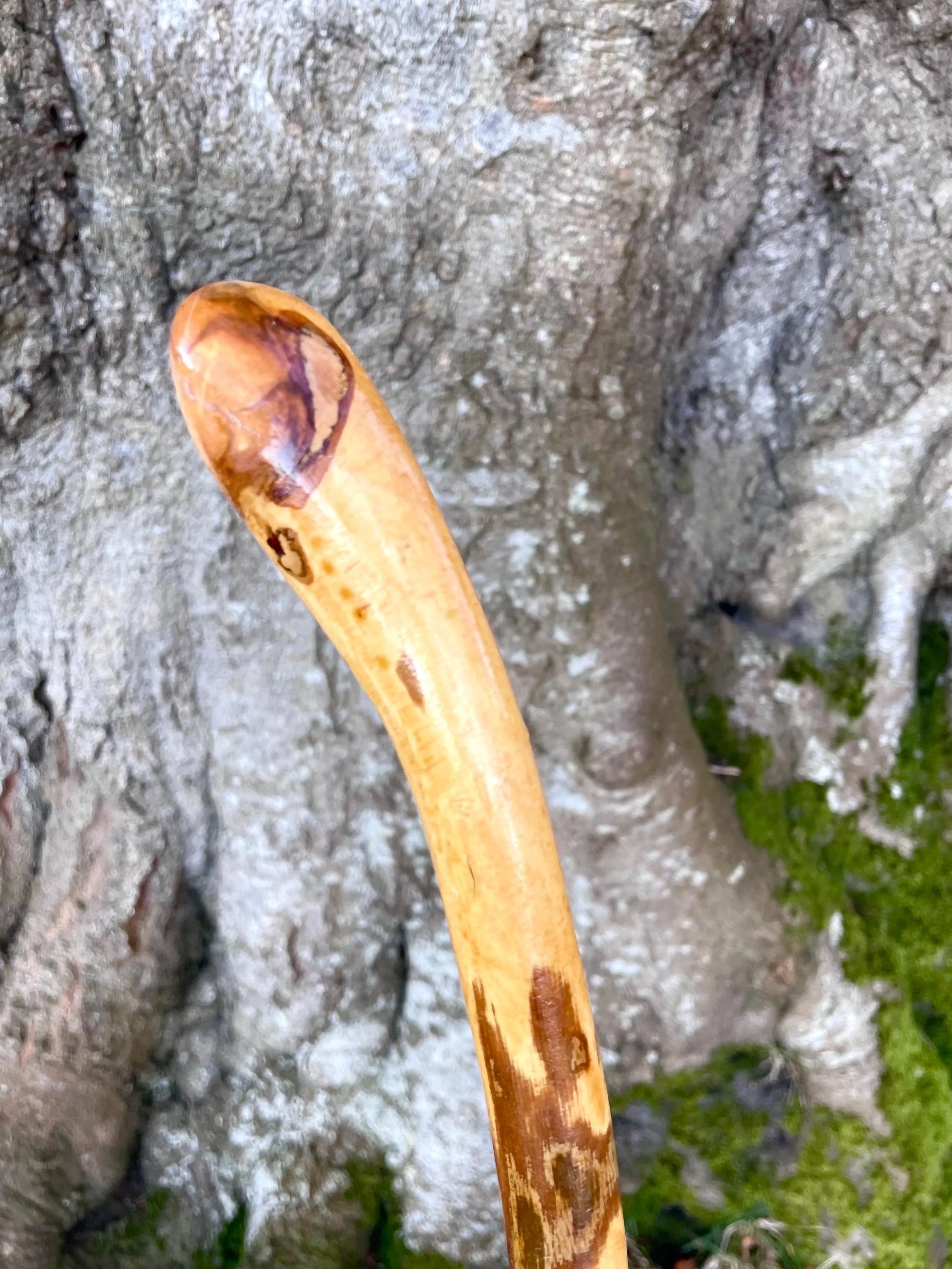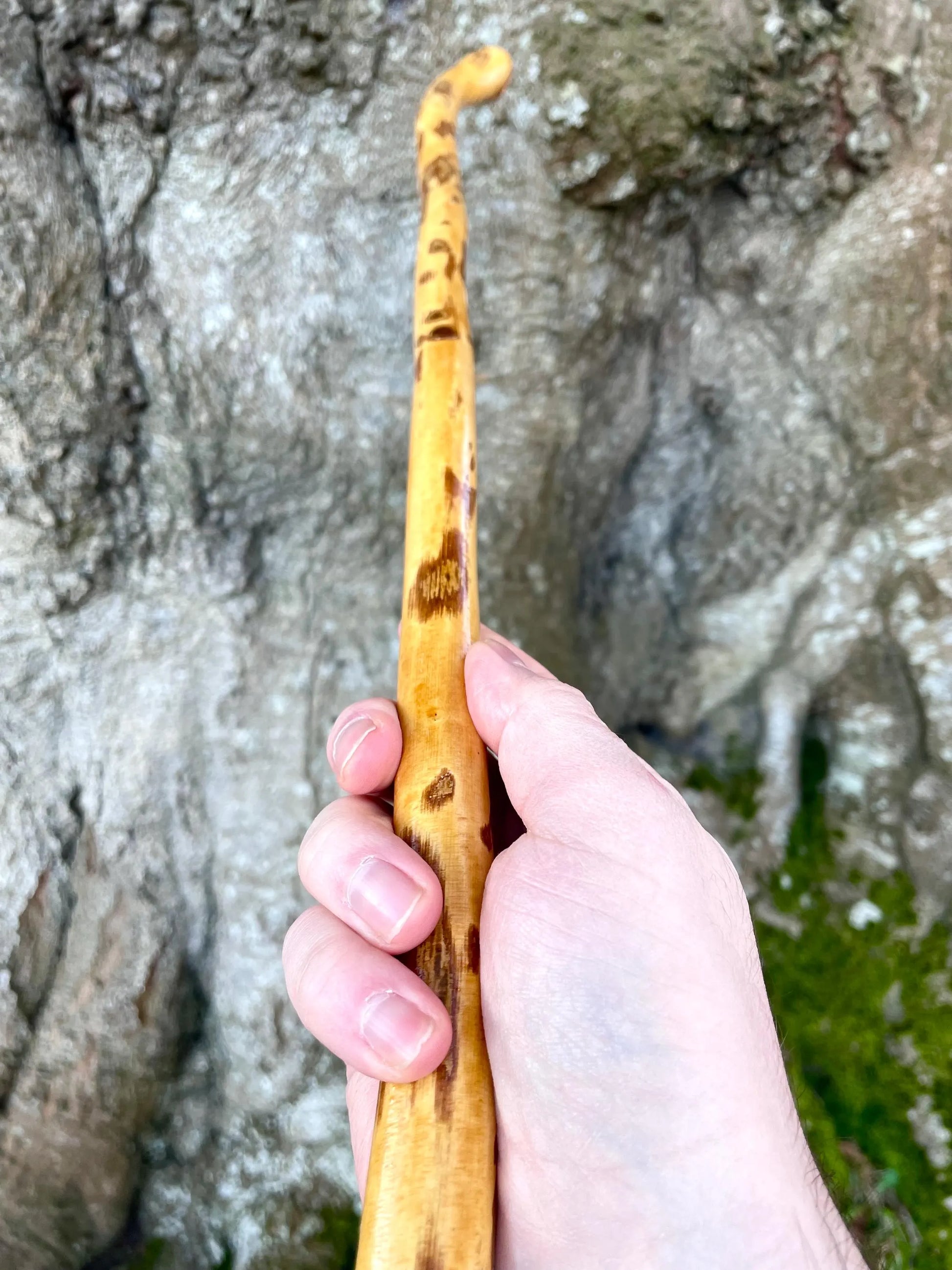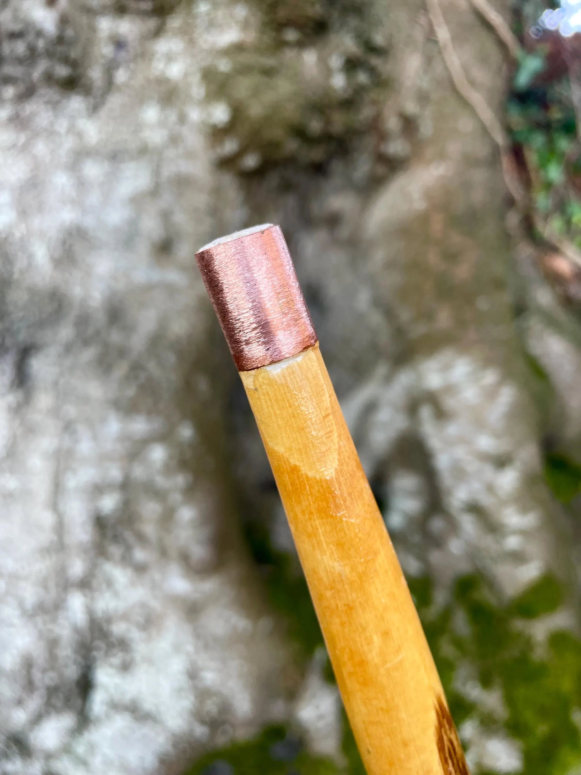 Elegant hazel walking stick with a copper ferrule, blending natural charm and fine detail. Handmade in Ireland, award winning Irish stick craft.