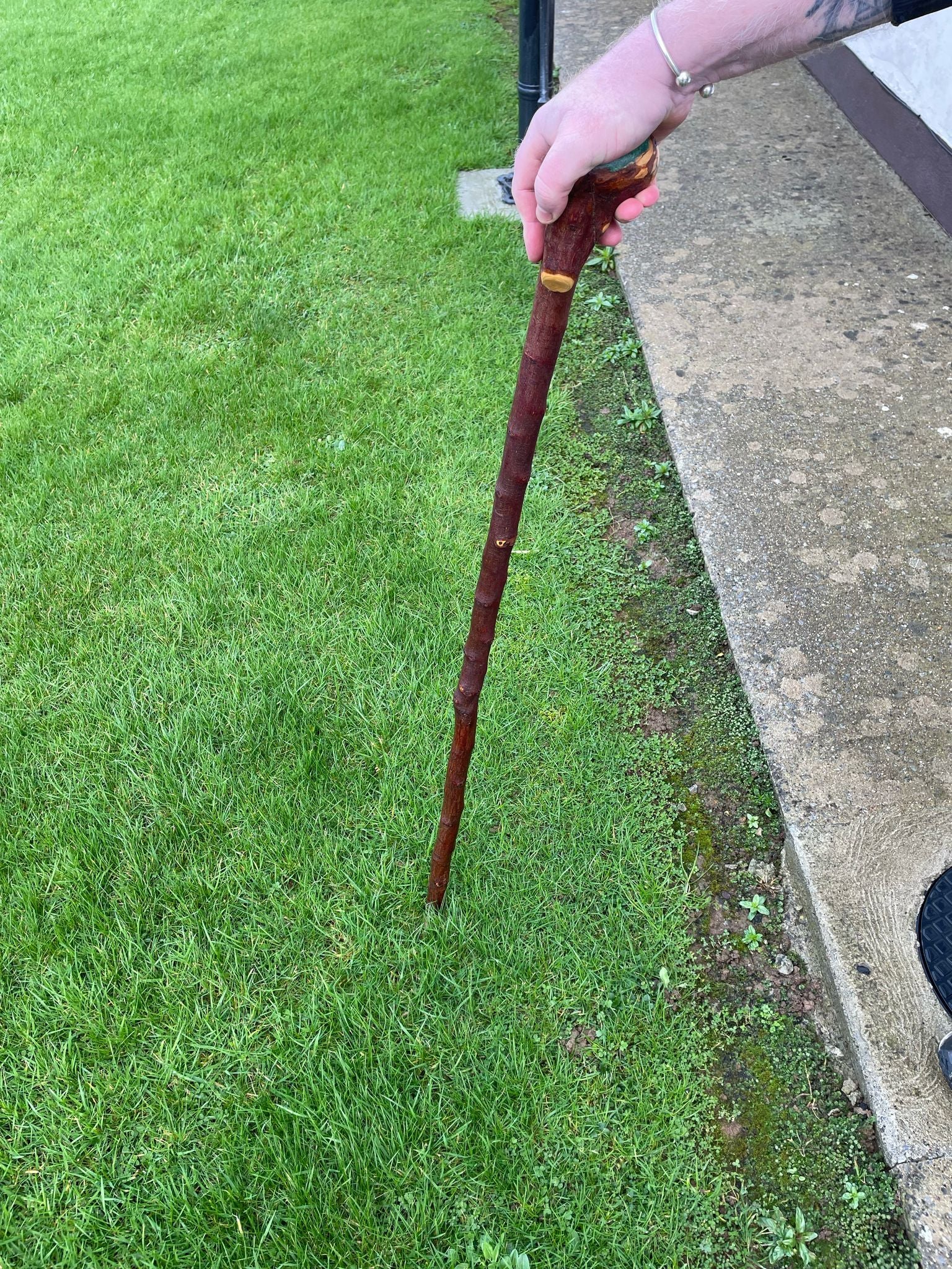 Strong Irish blackthorn walking stick with natural root ball handle, standing 43 inches tall. A striking piece of heritage, award winning Irish stick craft.