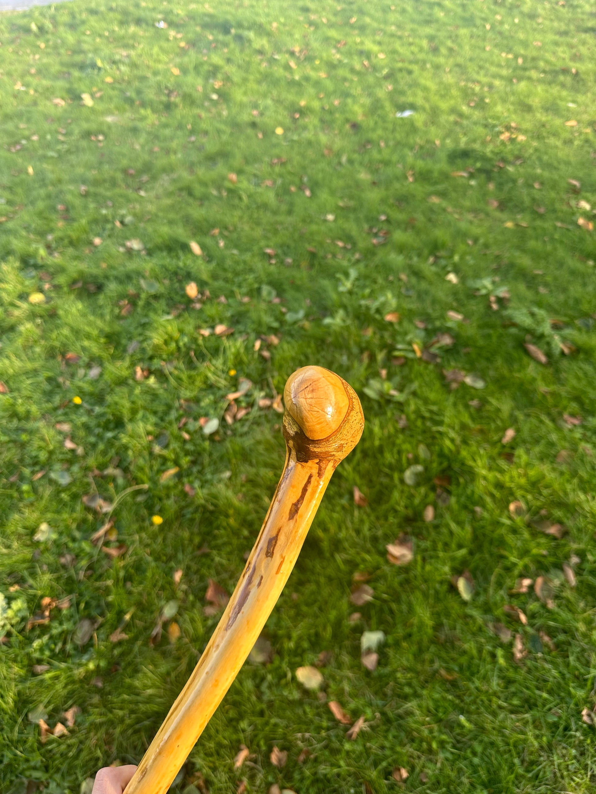 This one-of-a-kind Irish hazel walking stick is full of rustic charm, featuring a twisted, bumpy shaft and a rounded handle that sits naturally in the hand. With an oil finish that highlights the beautiful hazel grain, it’s both a reliable walking aid and a striking piece of Irish craftsmanship. Whether for hiking, everyday support, or as a collectible, this stick brings heritage and practicality together. The exact stick shown in the photo is the one you will receive. If you'd like it shortened, just let us know how much to trim in the order notes at checkout and we’ll customise it for you.