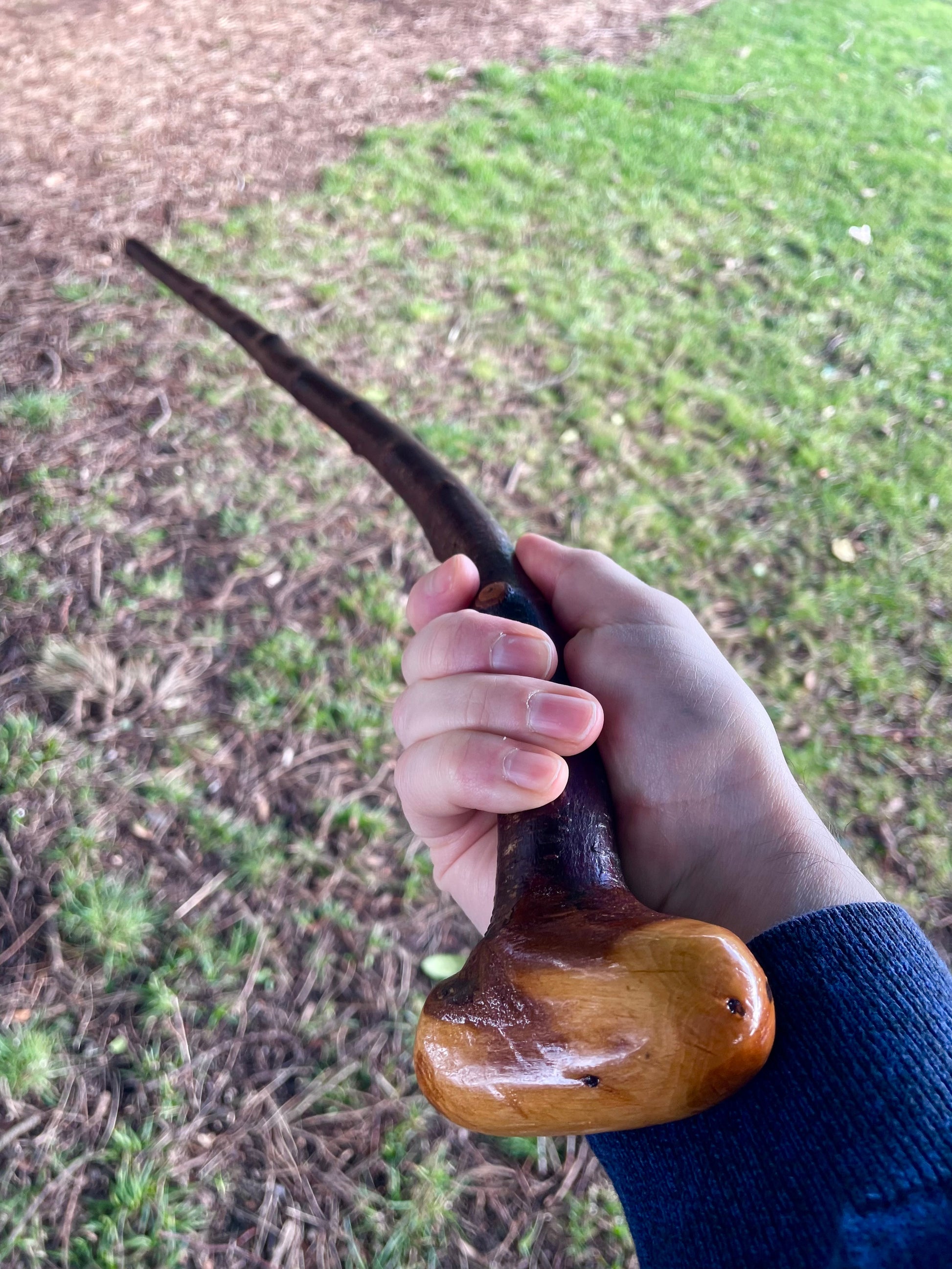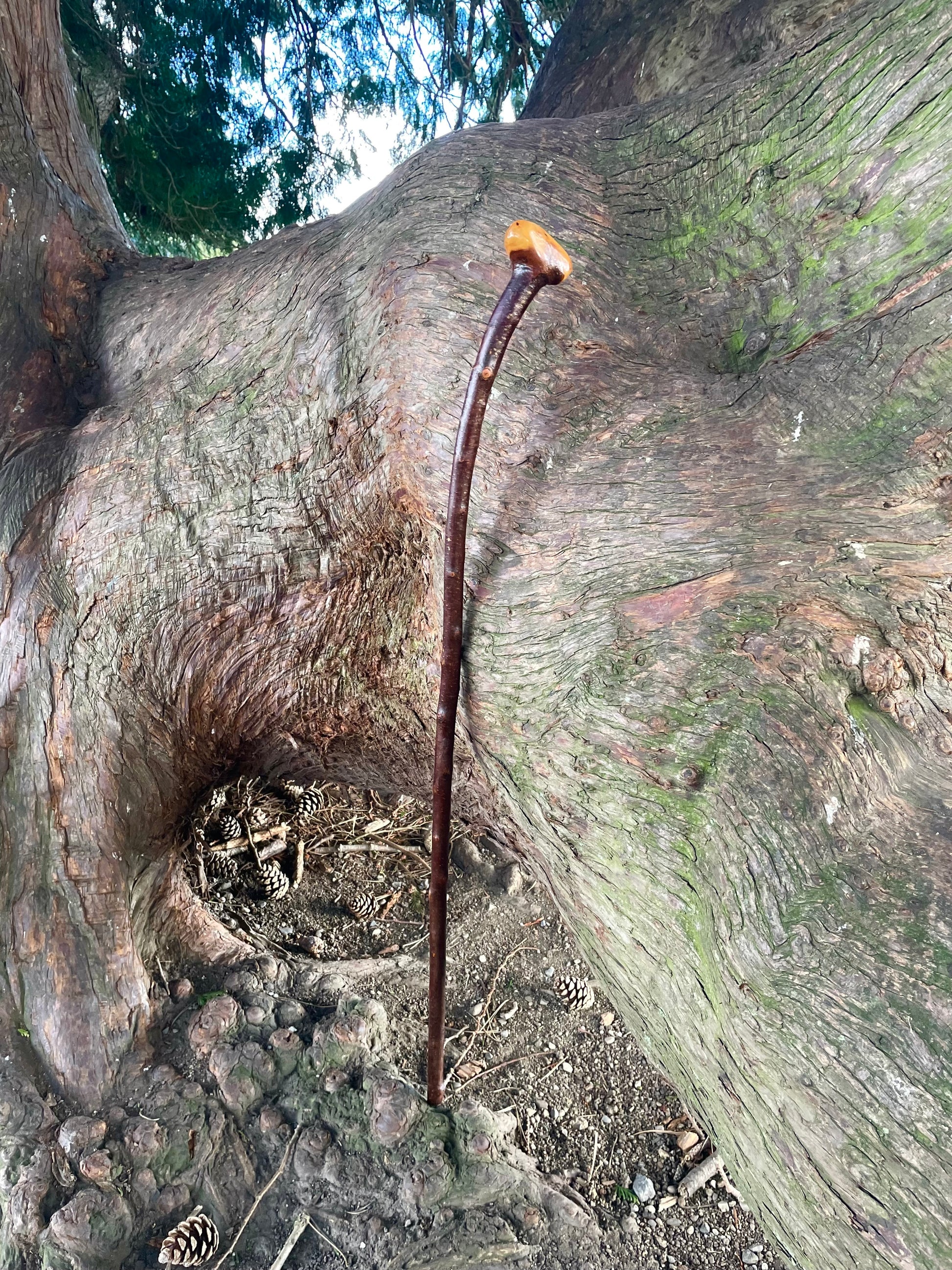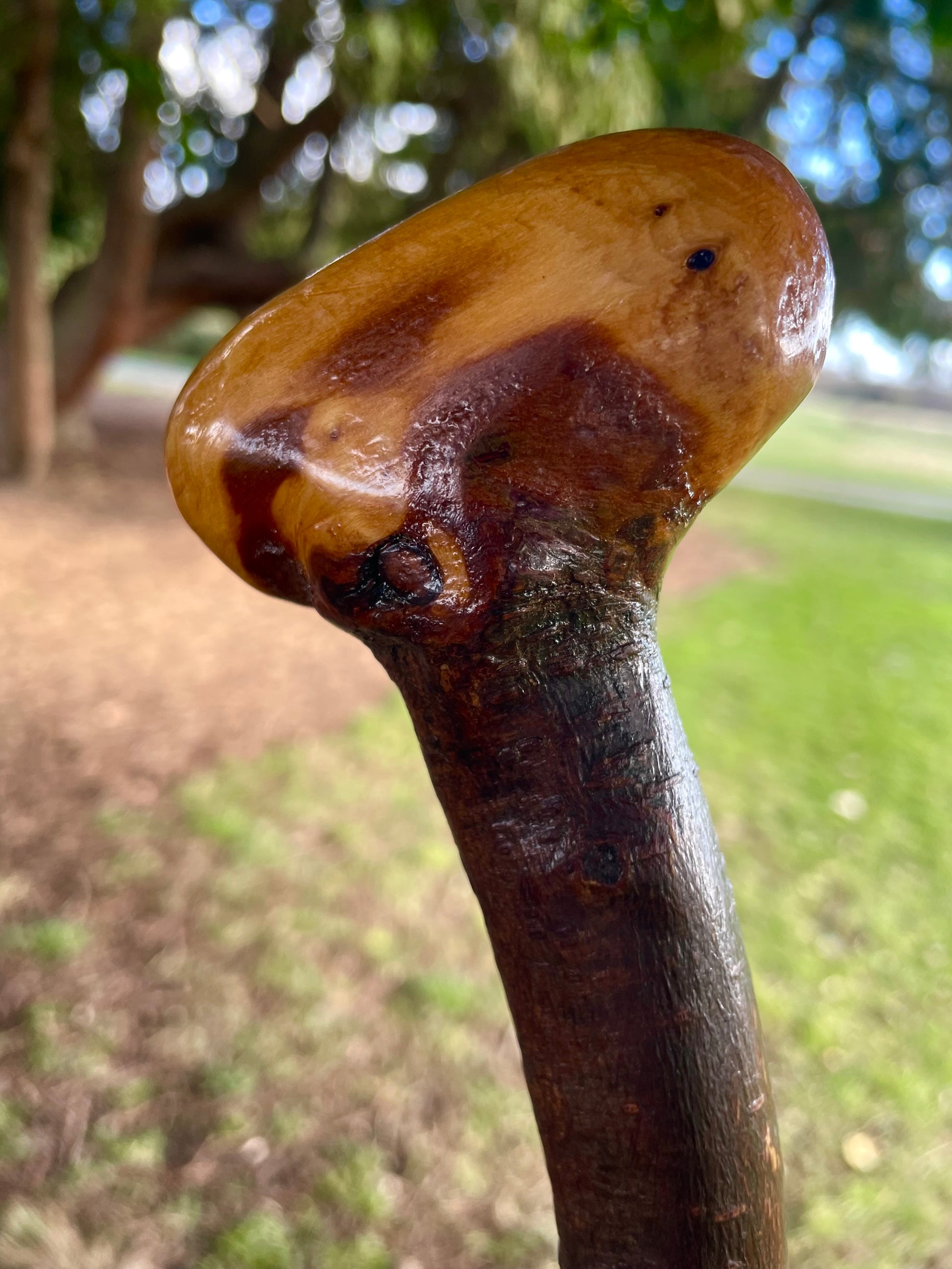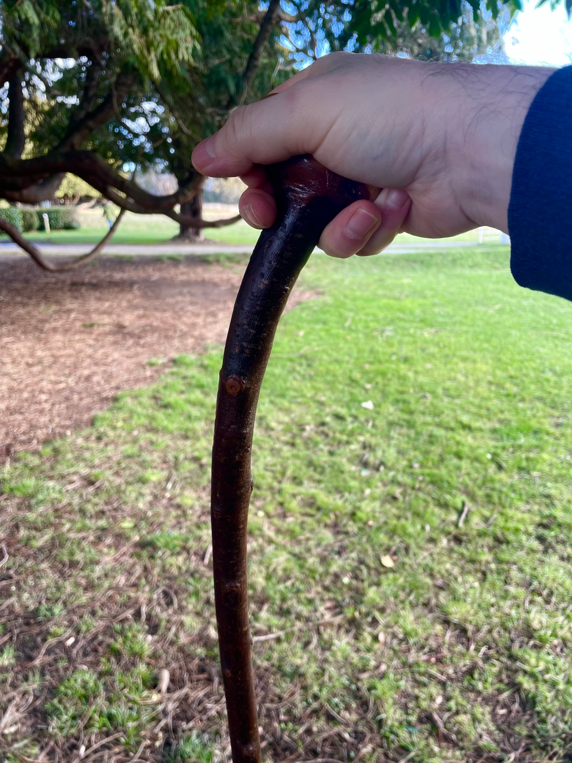 Smooth curved handle on this handcrafted Irish blackthorn walking stick makes it both stylish and supportive. Rustic and strong, award winning Irish stick craft.