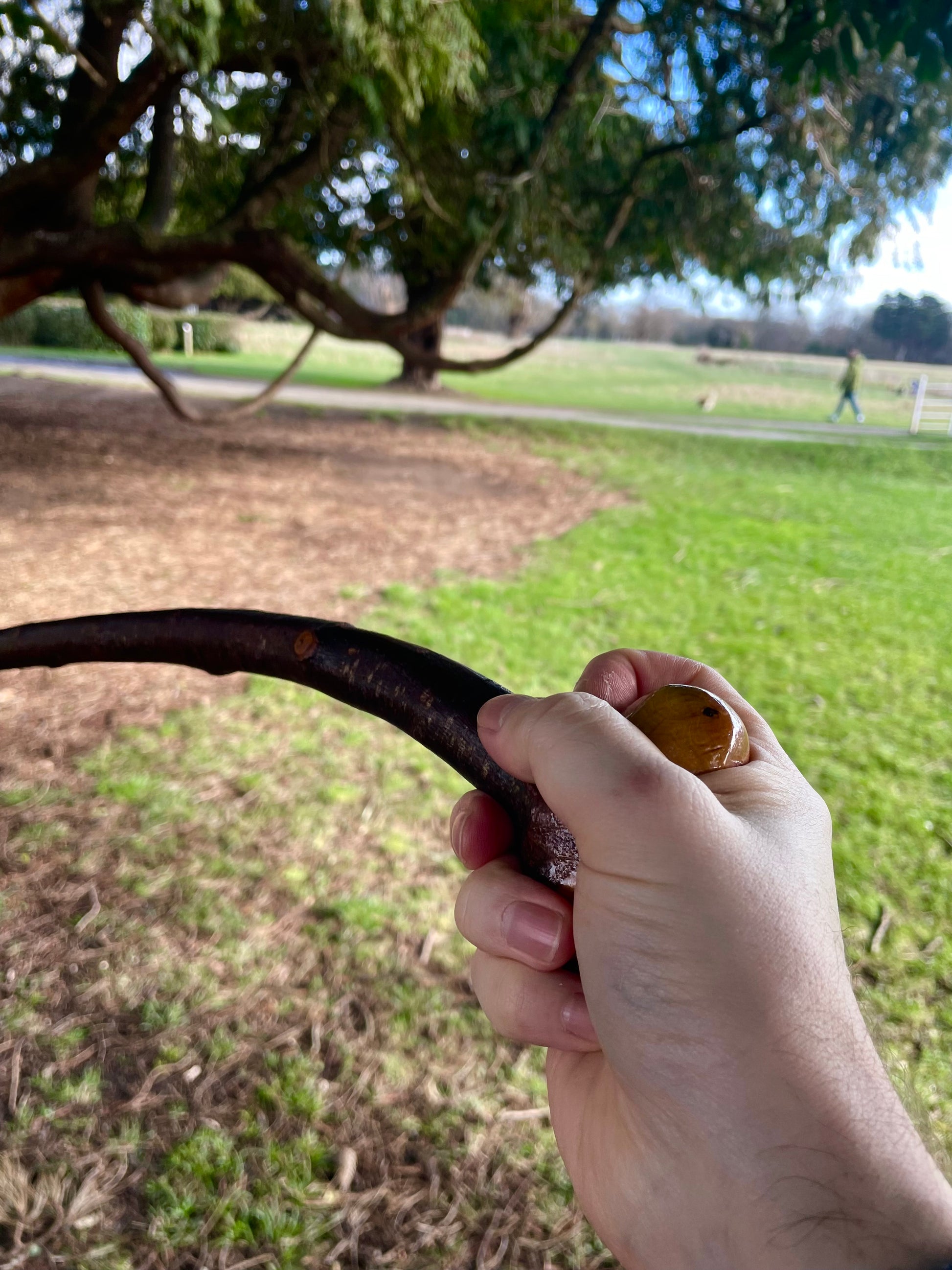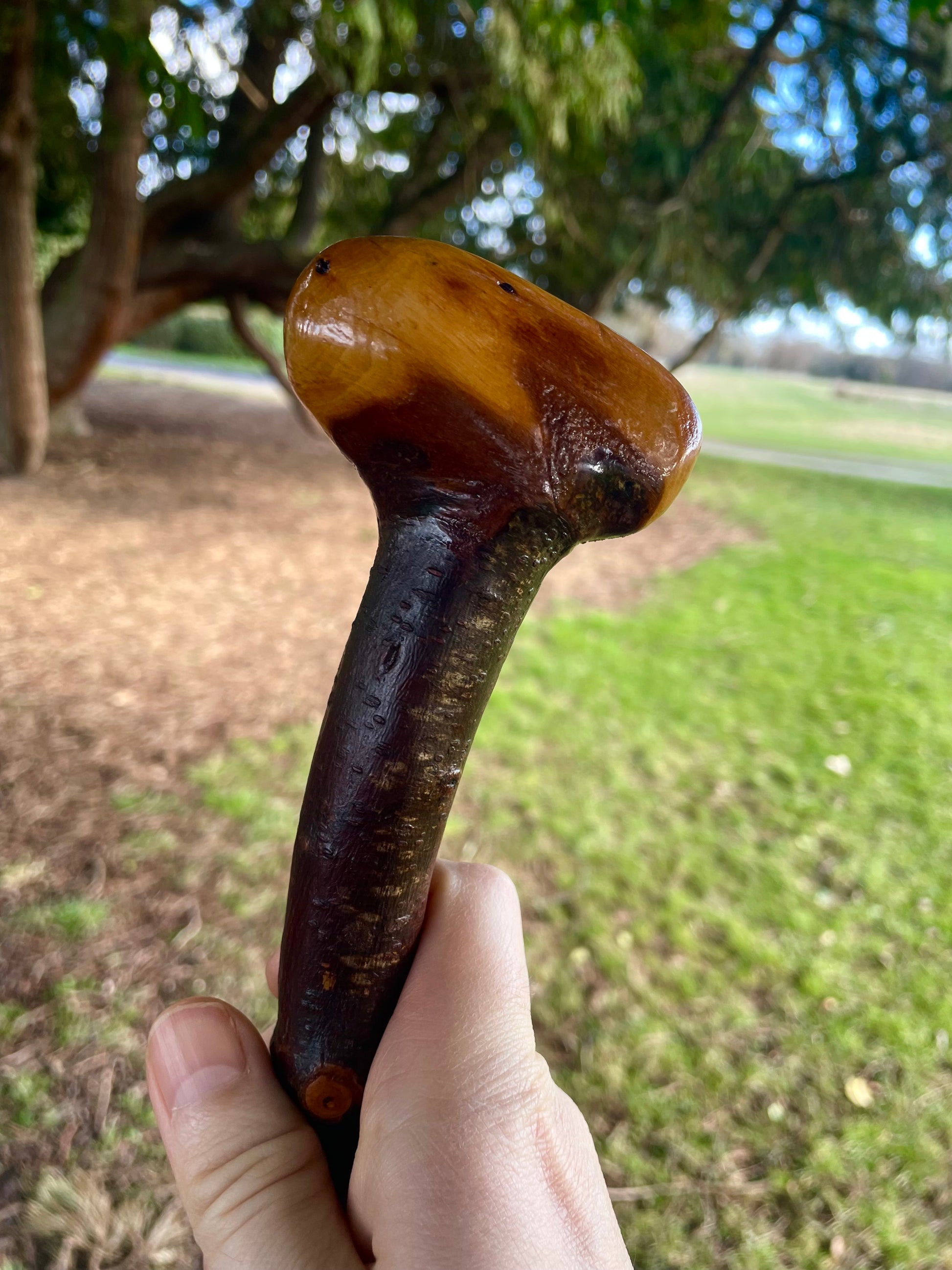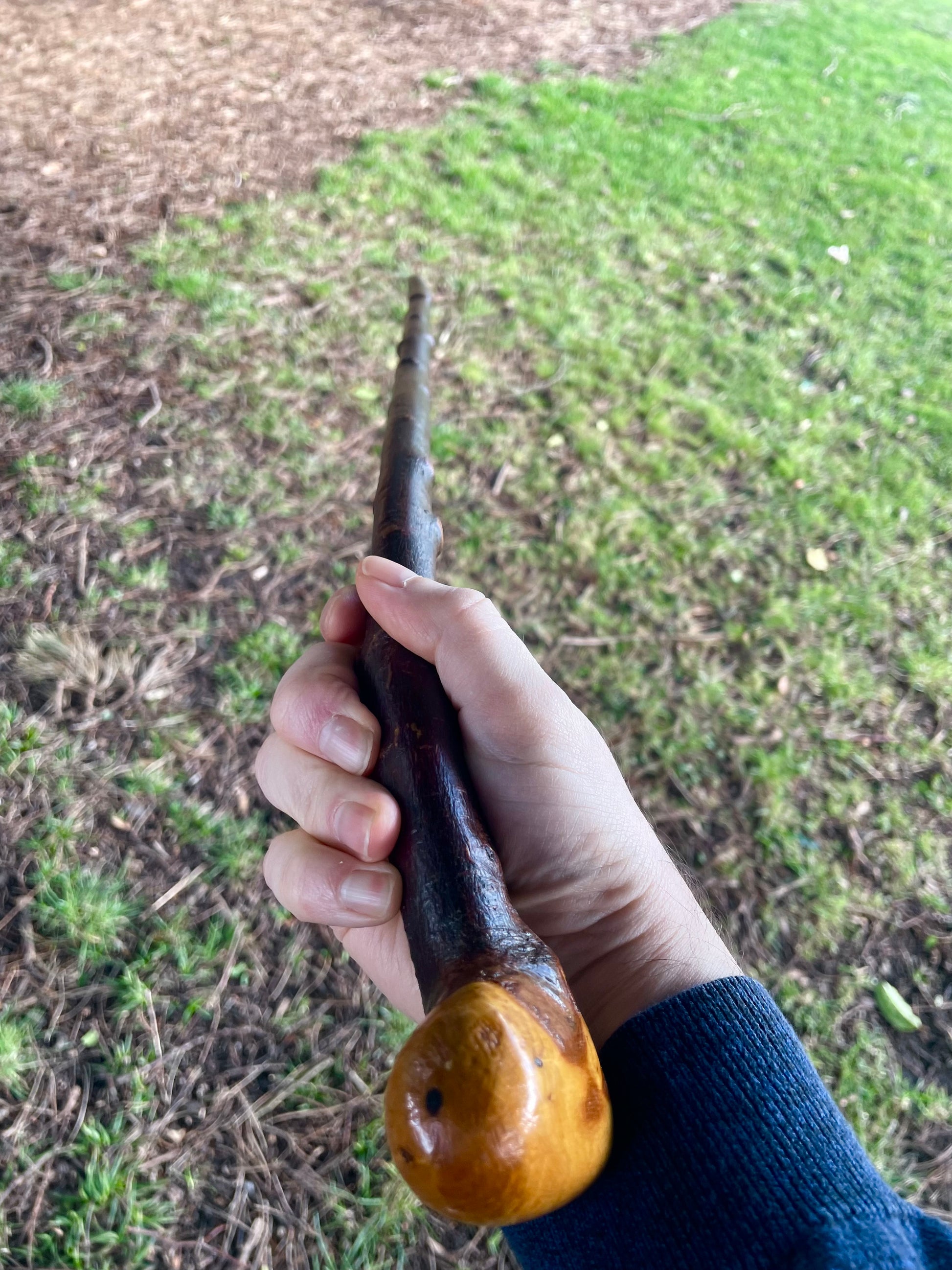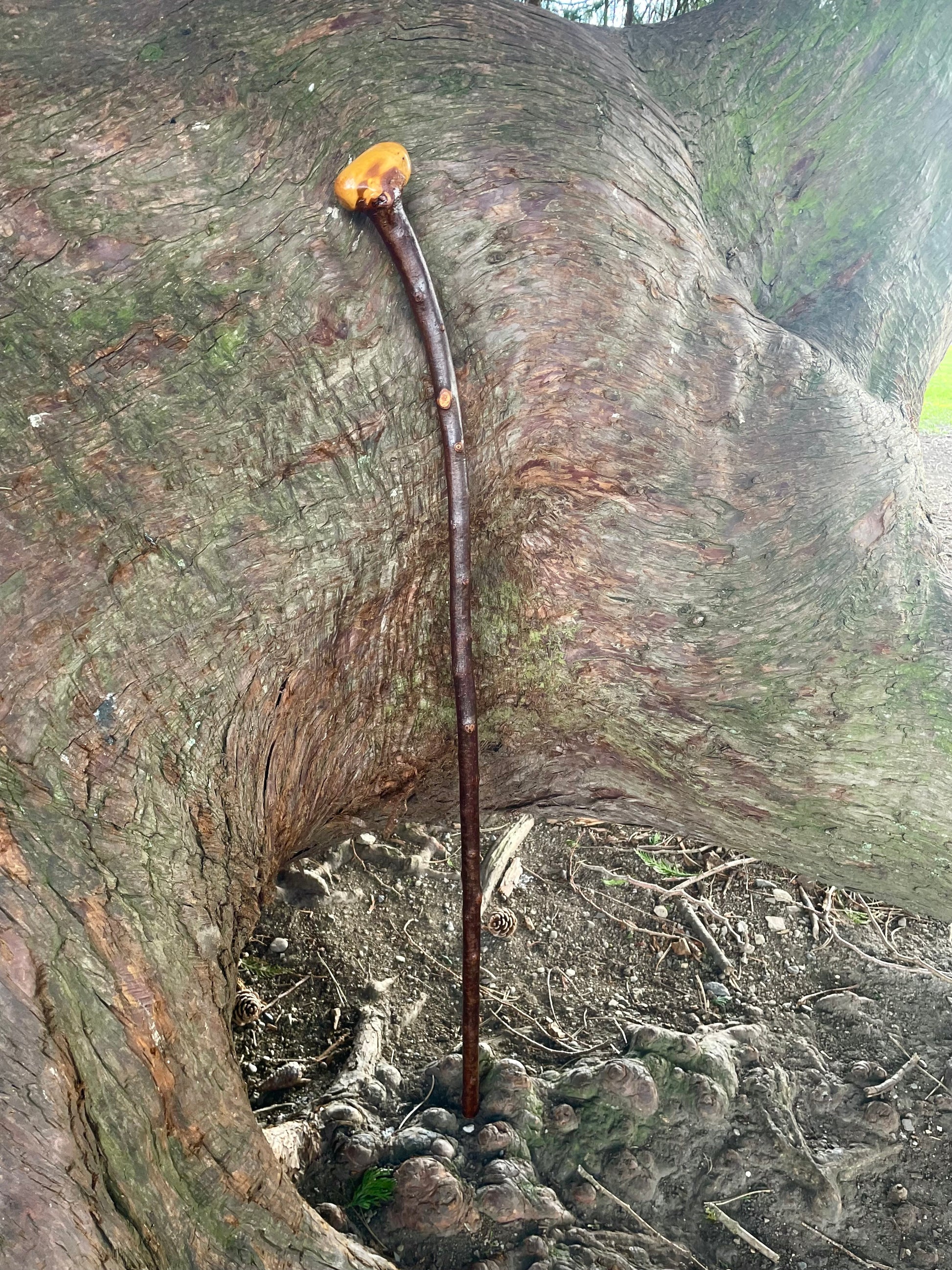 Smooth curved handle on this handcrafted Irish blackthorn walking stick makes it both stylish and supportive. Rustic and strong, award winning Irish stick craft.