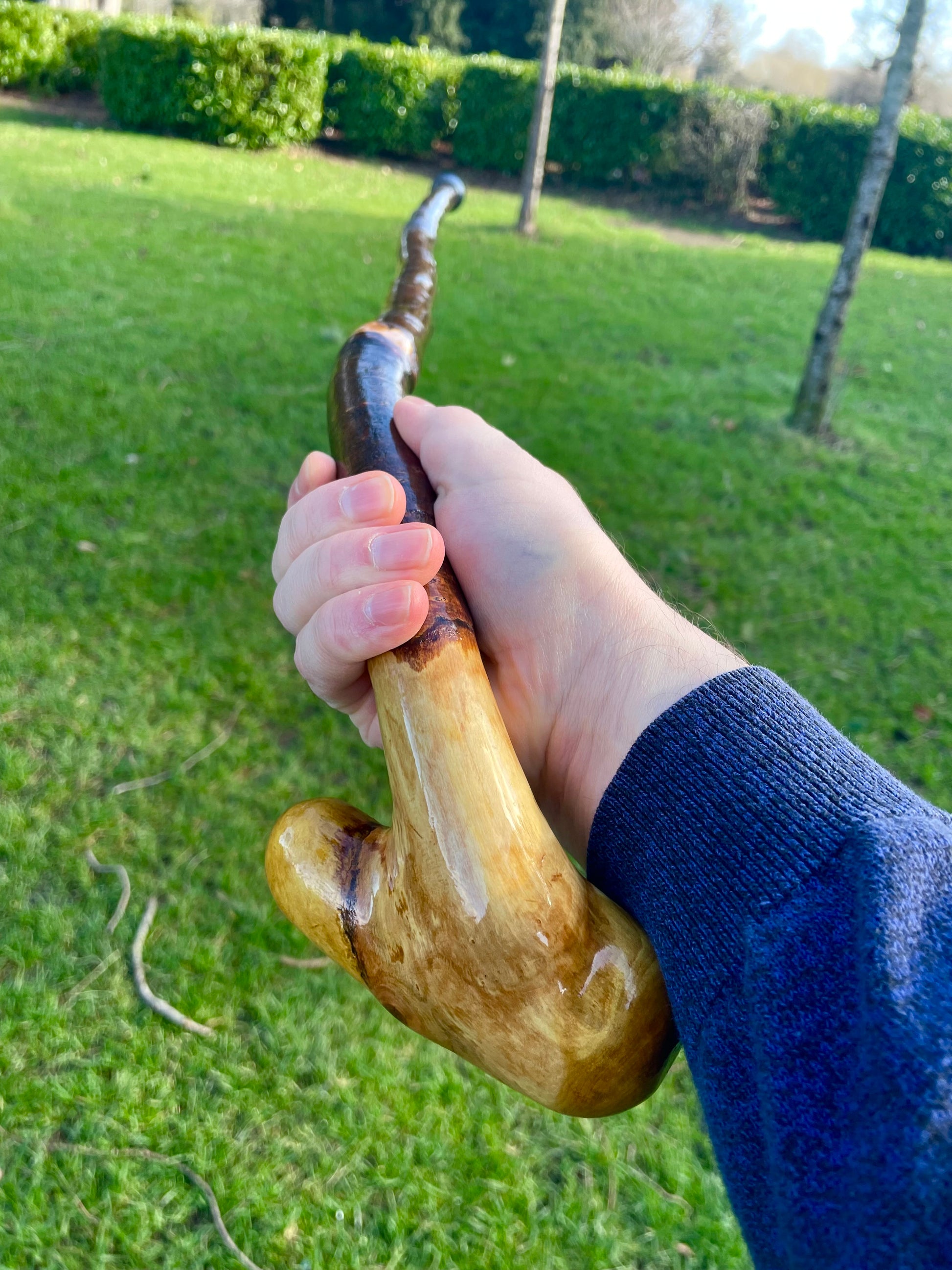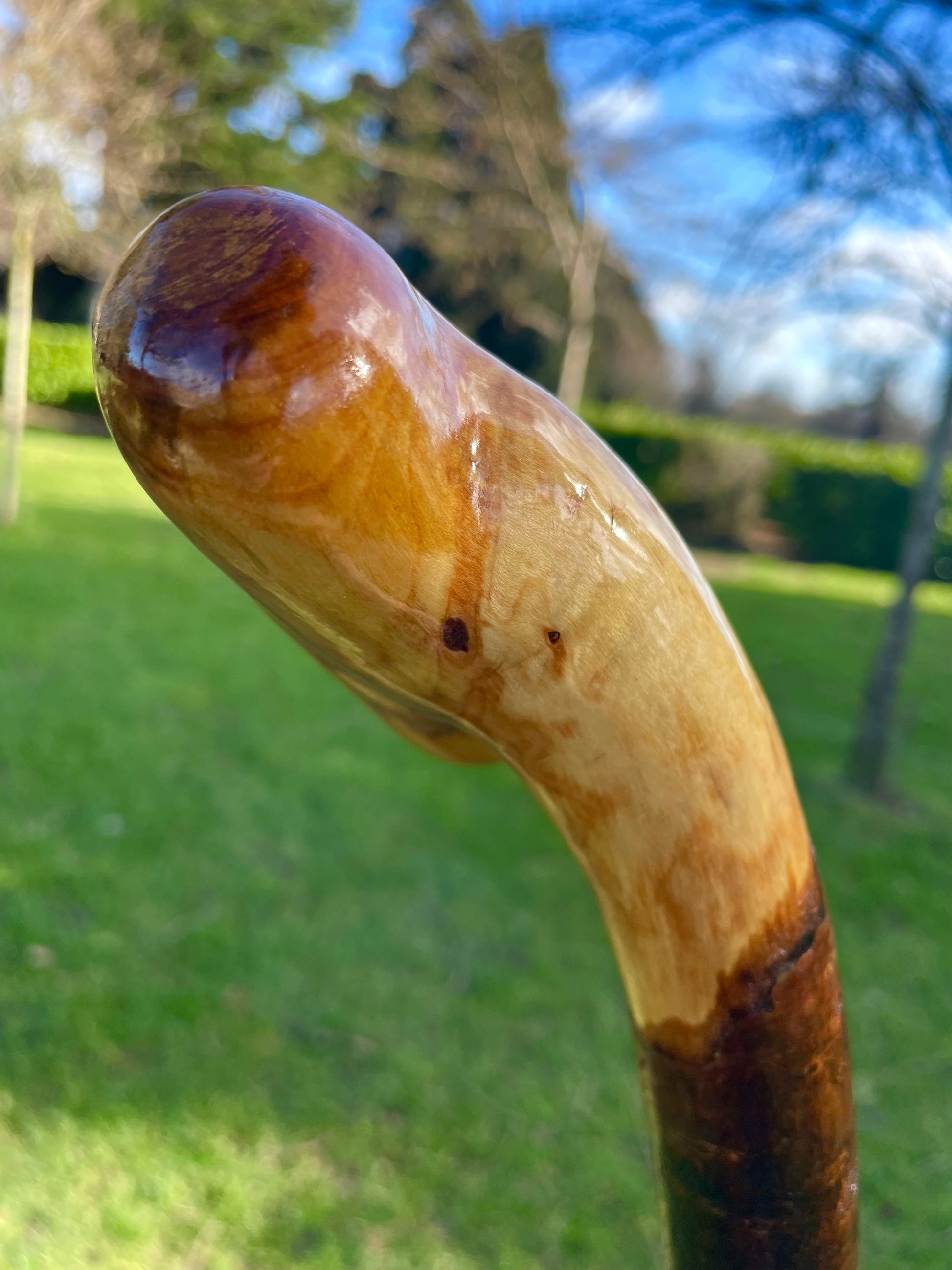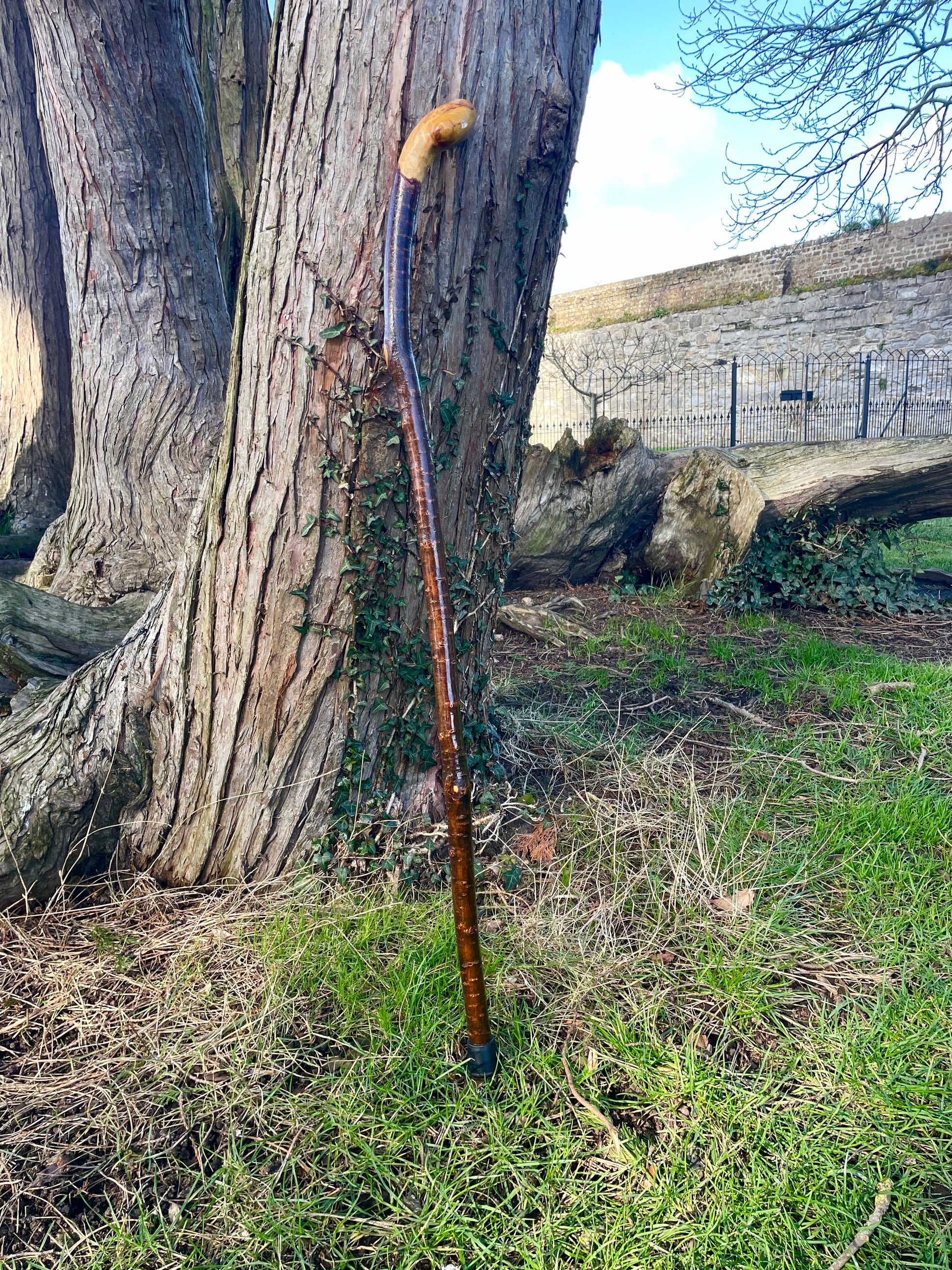Elegant Irish blackthorn walking stick with curved handle, handcrafted for comfort, balance, and heritage style. A true original, award winning Irish stick craft.
