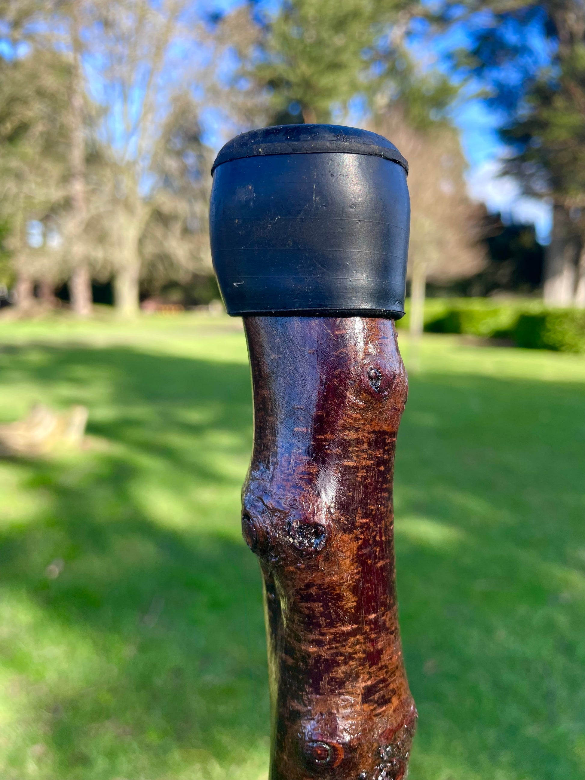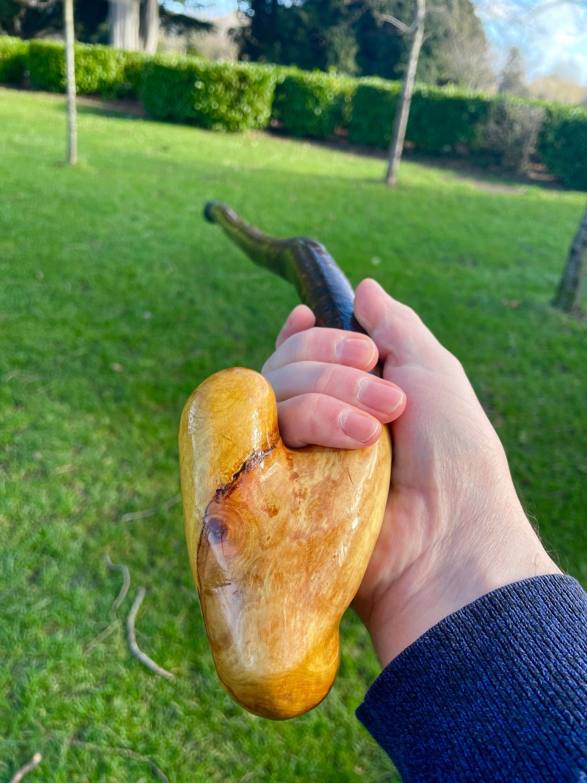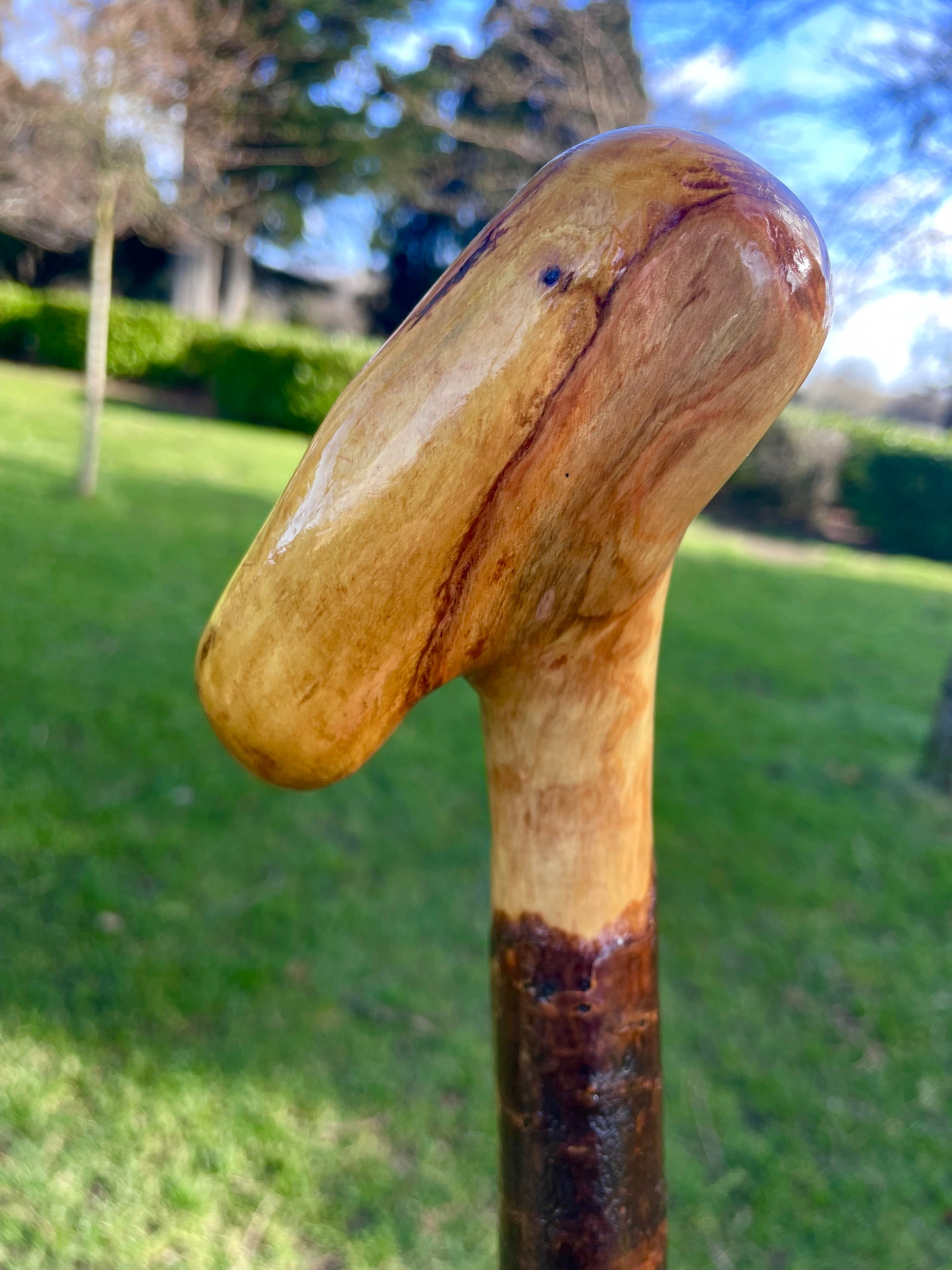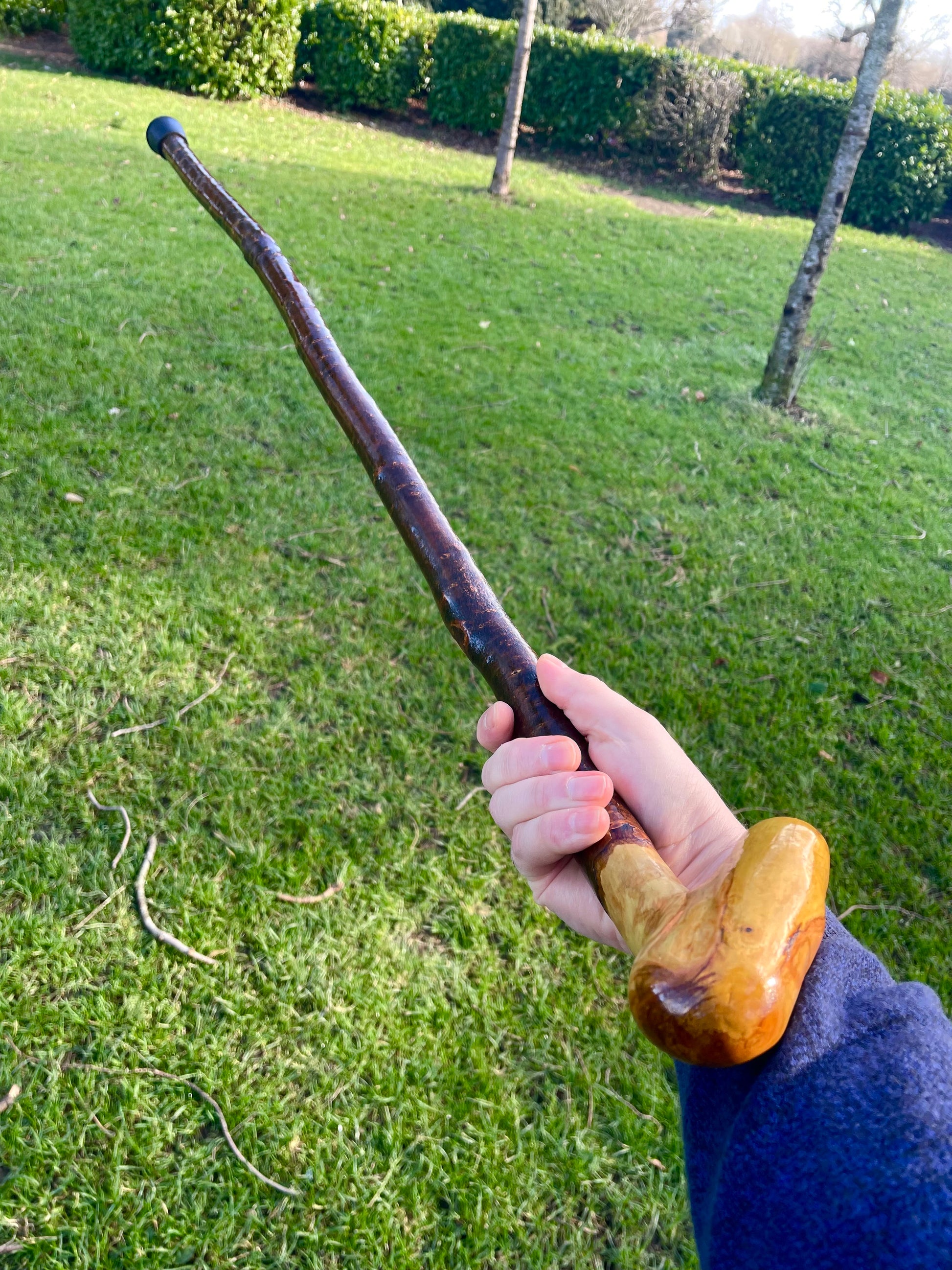 Elegant Irish blackthorn walking stick with curved handle, handcrafted for comfort, balance, and heritage style. A true original, award winning Irish stick craft.