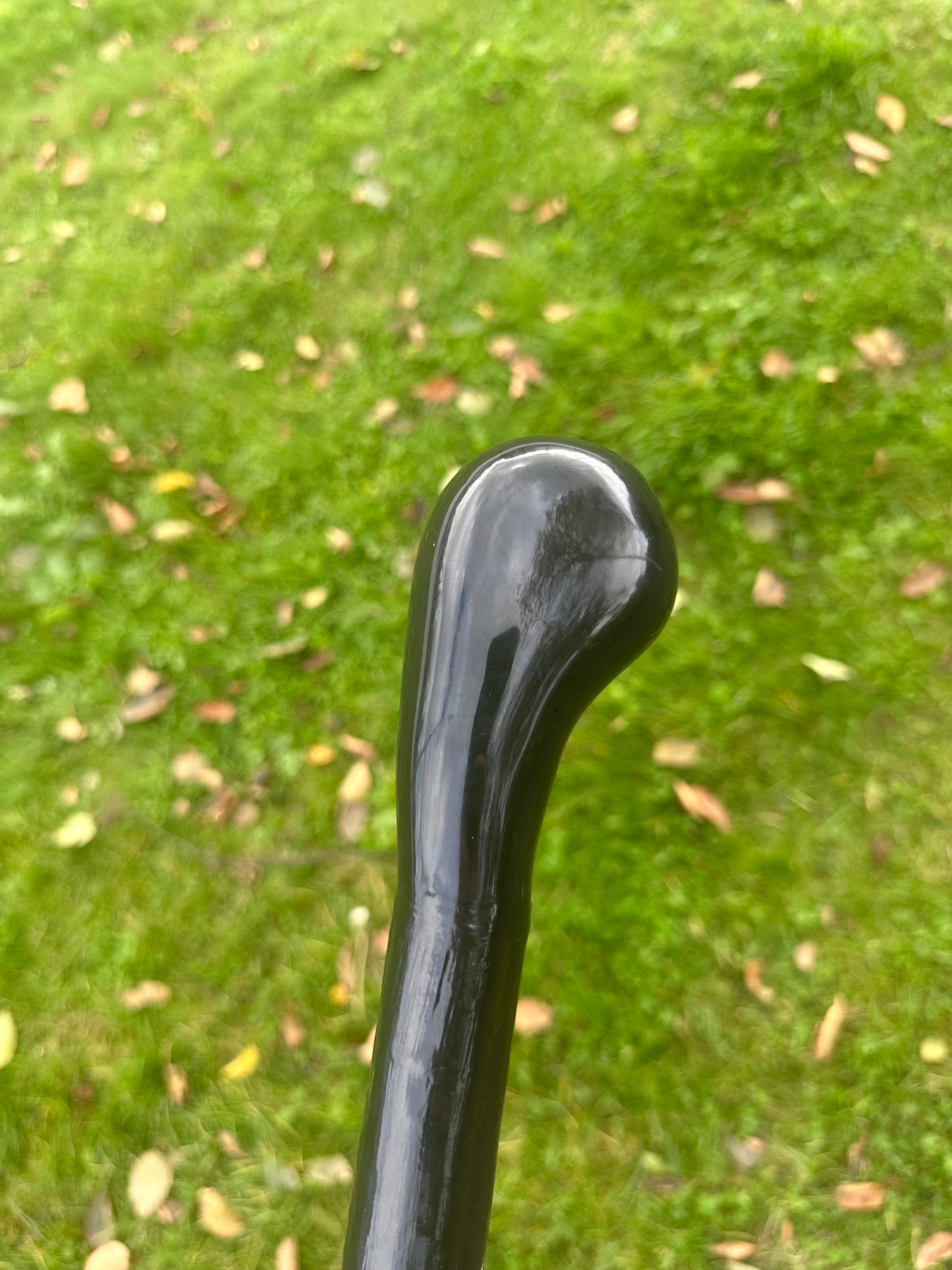 This one-of-a-kind Irish blackthorn walking stick features a smooth round knob handle and a striking black painted finish that enhances its bold character. At 100 cm (39 inches) in height, it’s ideal for everyday use or as a standout piece in any collection. The exact stick shown in the photo is the one you will receive. If you'd like it shortened, simply let us know how much to cut in the order notes at checkout and we’ll gladly adjust it for you.