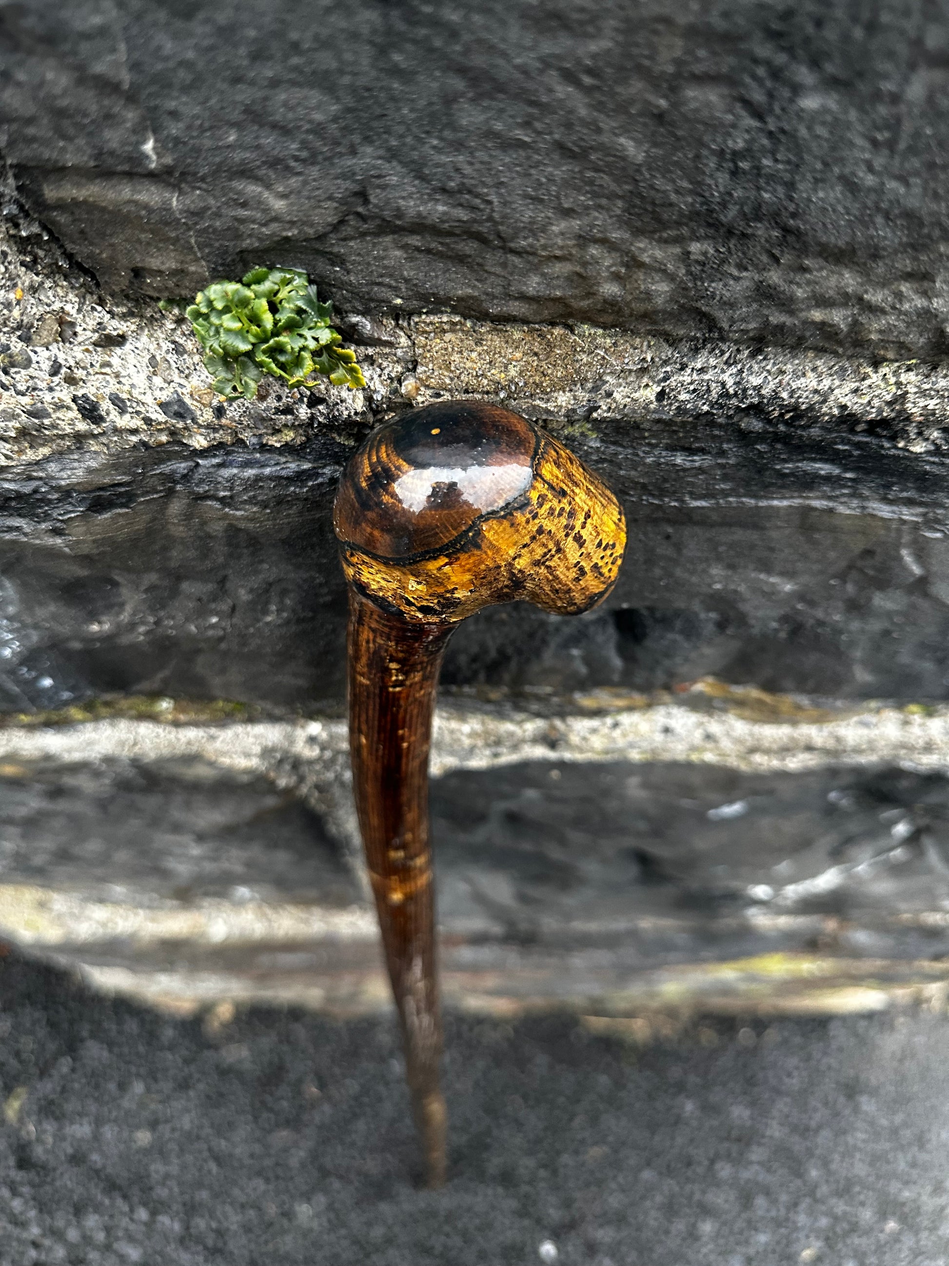 This stick features a large cylindrical knob head that gives a strong, comfortable grip. The back of the head has been finished with a homemade protective varnish, bringing out the rings of the wood and showing its natural age and history. The shaft is solid and sturdy, with the hazel bark left on to keep its raw, natural beauty intact. At 106 cm and just 240 grams, it’s light to carry but still strong enough for everyday walking support or hiking. As always, you’ll receive the exact stick shown in the photo, and if you want it shortened, just leave your preferred length in the order notes at checkout.