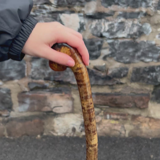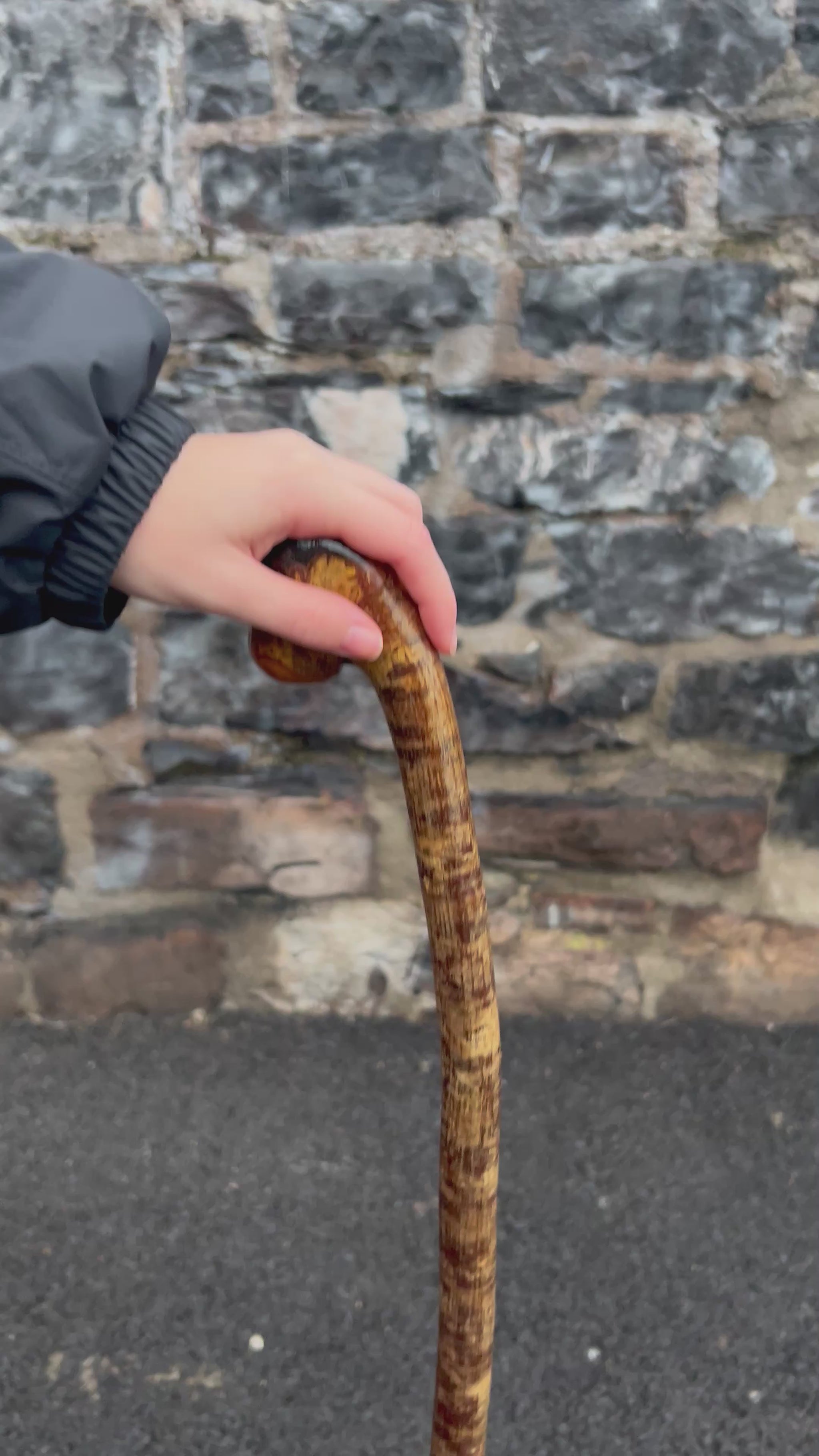This one-piece hazel walking stick features a leaning-over knob head that gives a strong, natural grip whether you're walking, hiking, or resting your hand on it. The hazel shaft is smooth and clean, keeping its natural charm while still being tough enough for real use. The head is finished with a homemade varnish blend, giving it a protective shine and bringing out the grain of the wood. At 100 cm and just 270 grams, it’s a light but reliable stick — easy to carry and strong in the hand. As always, you’ll receive the exact stick shown in the photo, and if you want it shortened, simply leave your preferred length in the order notes at checkout.