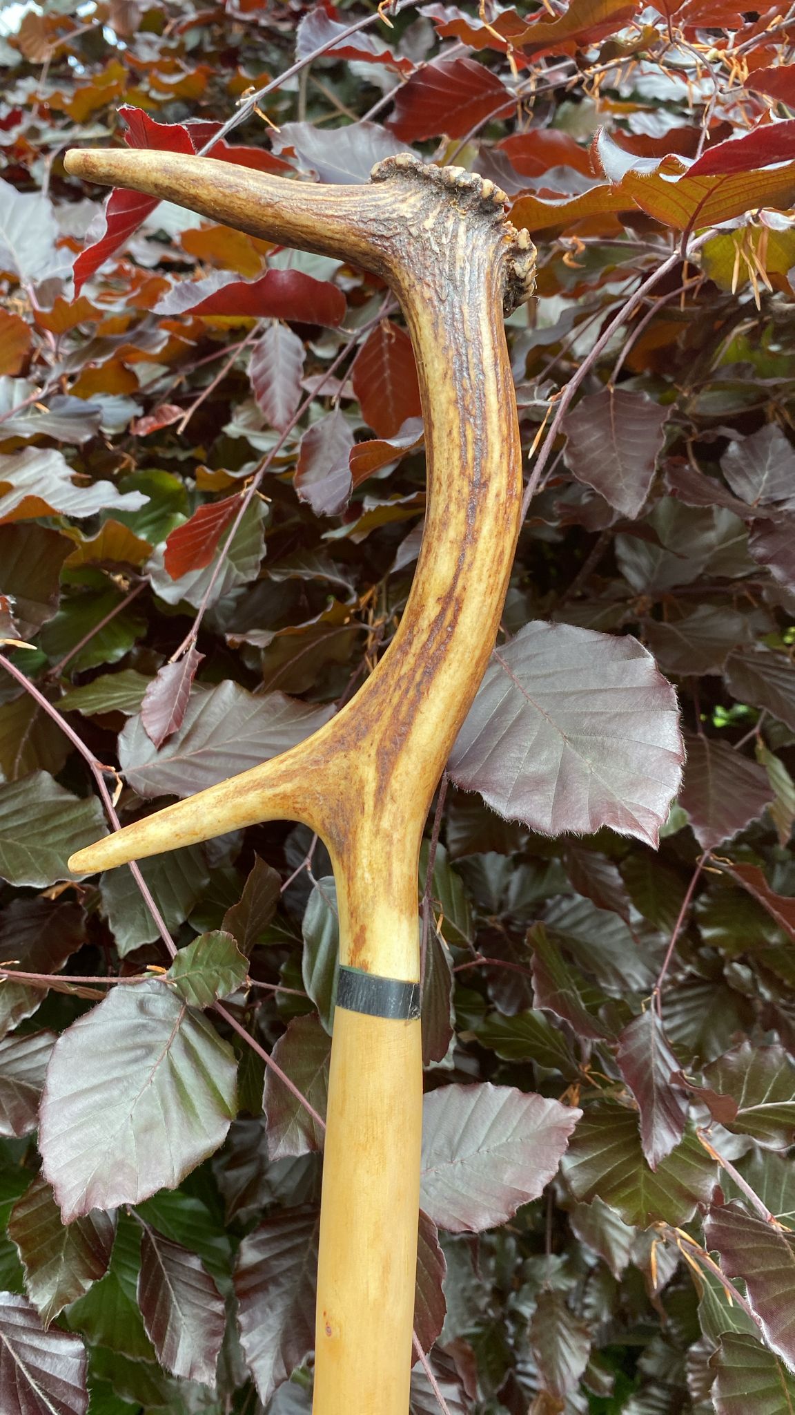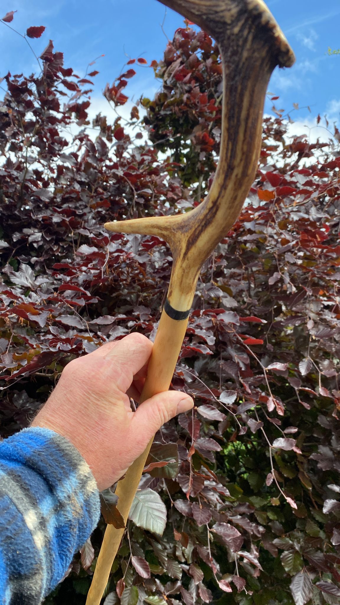 Luxury Irish hiking stick with a holly wood shaft and real deer antler handle—bold, rare, and handcrafted. A standout piece, award winning Irish stick craft.